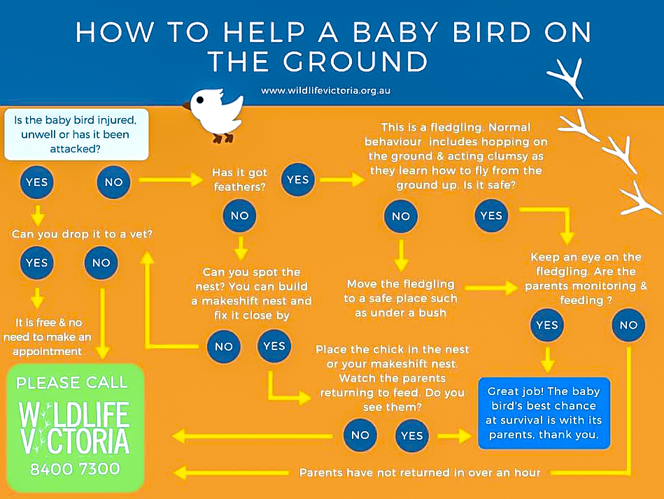 Given recent strong winds and heavy rain, several chicks have found themselves in trouble. This “flow chart” from Wildlife Victoria explains key decisions to be made when you find a chick on the ground: