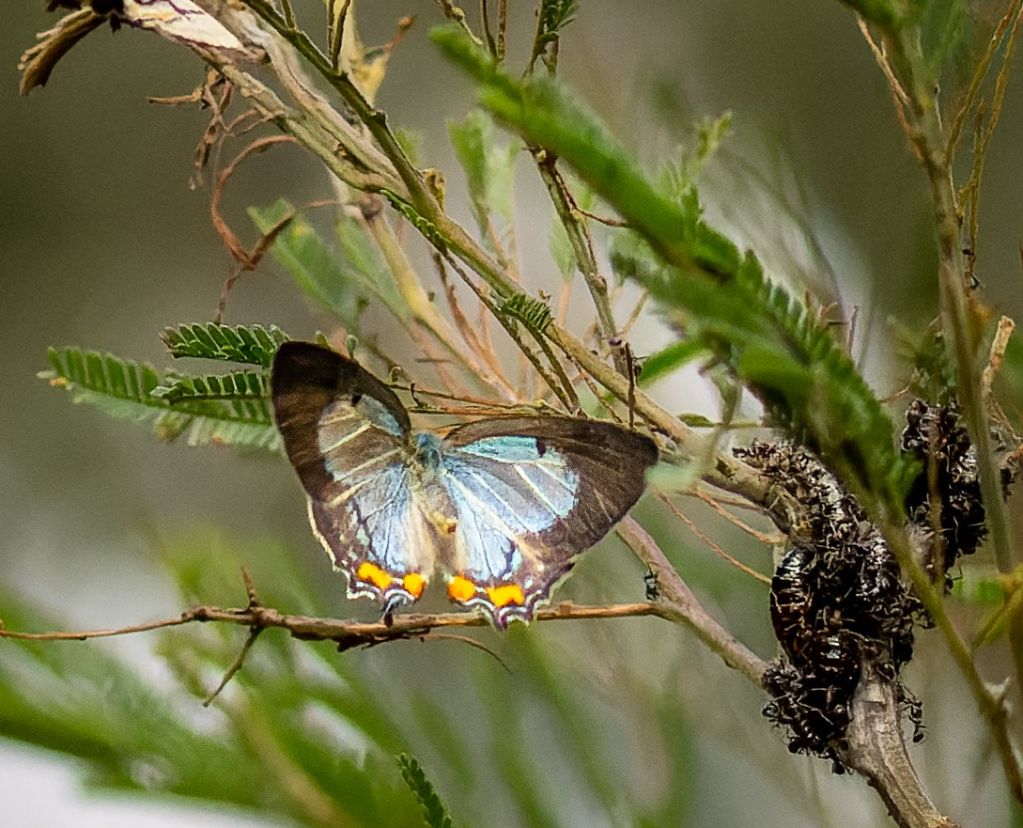 In his e-mail to us, Ken named this butterfly species the “Imperial Hairstreak” which may refer to their colouration on the underside – buff with black streaks – along with the orange on the hindwings which occurs on both sides. We know them as the “Imperial Blue” which obviously refers to the dorsal view shown in Ken’s first photo above.