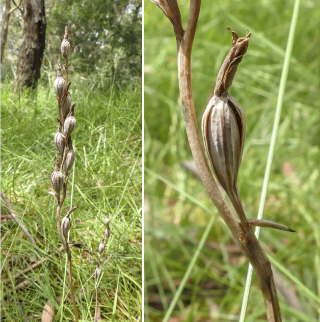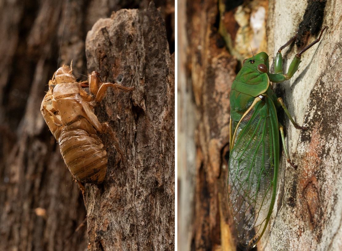 Wendy’s photos from a couple of years ago shows the shell of the Greengrocer Cicada (Cyclochila australasiae) as it has hatched from a nymph into the large beautiful green adult cicada on its right. The adults only live for about six weeks. They fly around, mate and breed over the summer to start the cycle again.