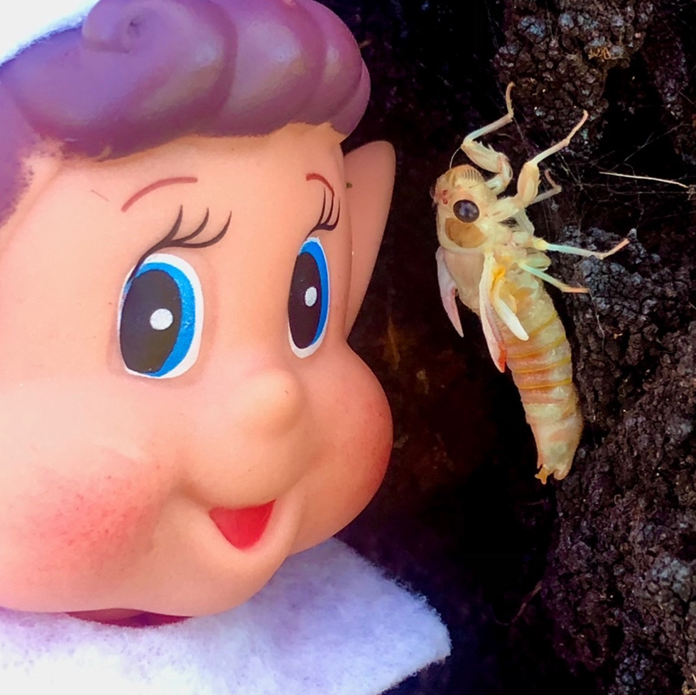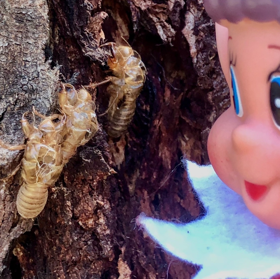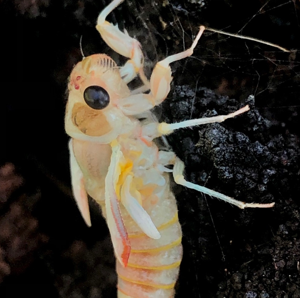 What was that Nymph – is that like an elf? You will all be familiar with the loud, shrill sounds of the cicada as the males call to attract females. The females fly to the males, they mate, then the females lay eggs in the bark of trees. The juveniles hatch, walk down the tree trunks and burrow into the ground where they live for several years, feeding off the sap of tree roots. The recent spell of warm, humid weather is just what the cicadas have been waiting for to come out of the ground and shed their shells. Our elf found a nymph that has emerged from the ground ready to find a spot on a tree to turn into an adult cicada.