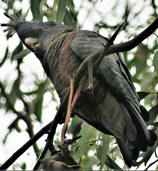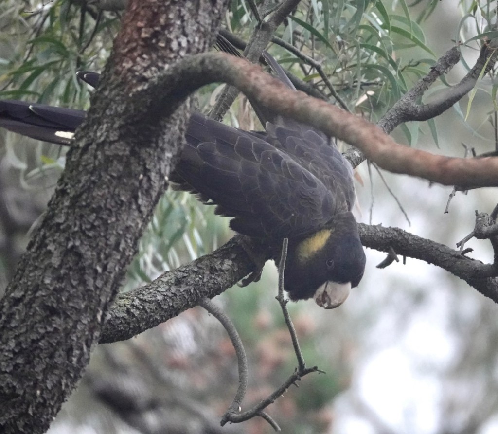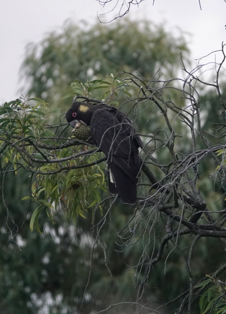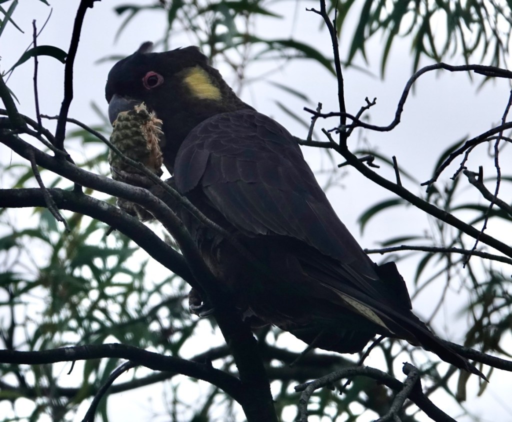 Last month, we reported that the Yellow-tailed Black-cockatoos are back in the park and our corridor in numbers. Even though not their traditional food, the cockies do seem to be rather partial to Monterey Pine cones. If you’ve ever picked up a green cone, you’ll know just how hard they are before they eventually dry out and burst open to cast their seed out on the wind.