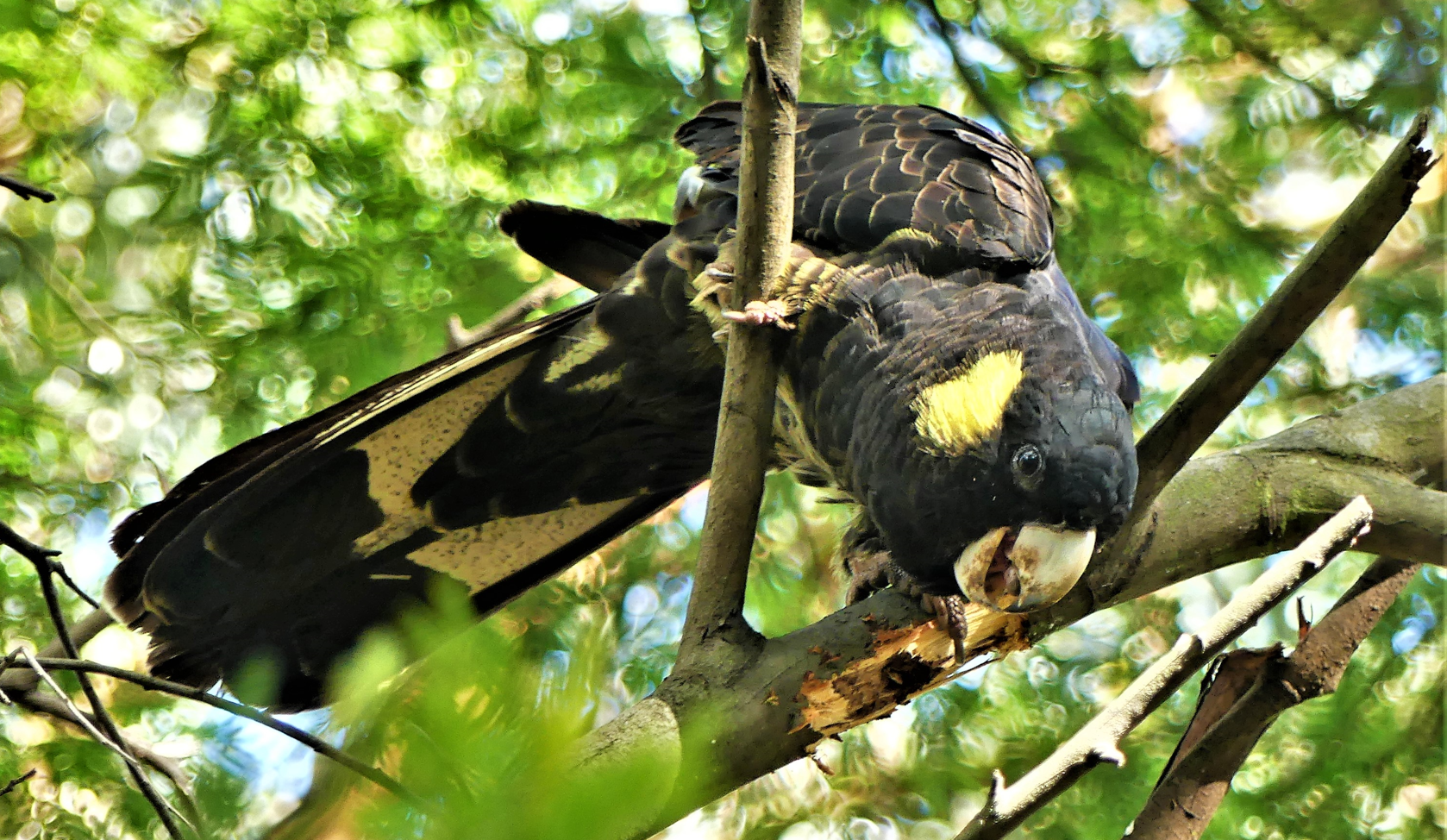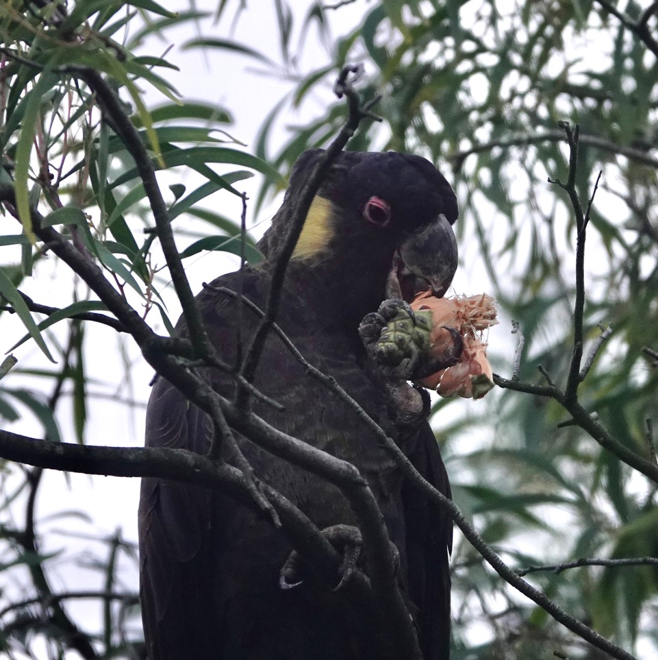 Last month, we reported that the Yellow-tailed Black-cockatoos are back in the park and our corridor in numbers. Even though not their traditional food, the cockies do seem to be rather partial to Monterey Pine cones. If you’ve ever picked up a green cone, you’ll know just how hard they are before they eventually dry out and burst open to cast their seed out on the wind.
