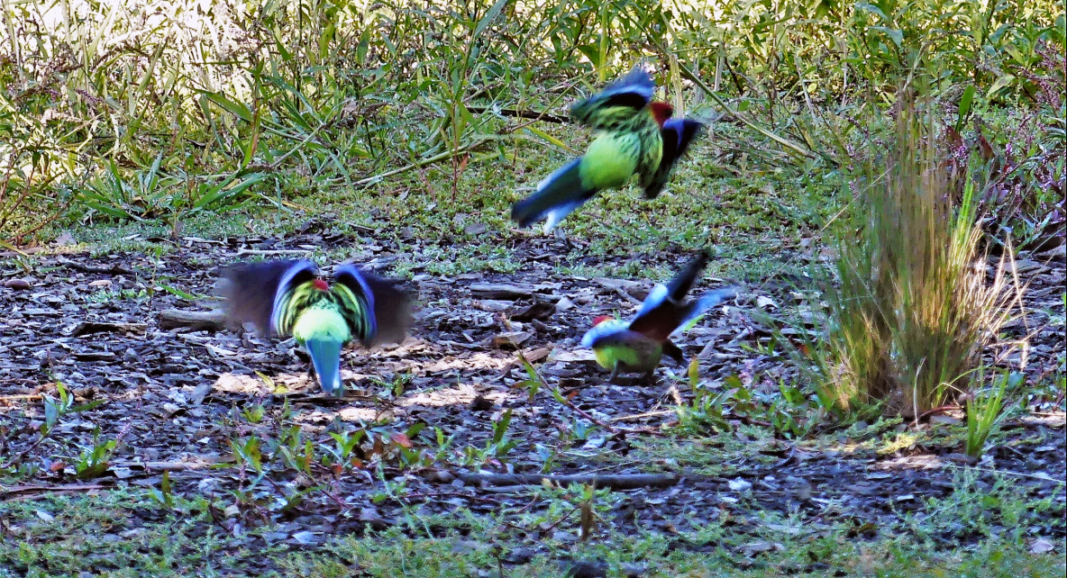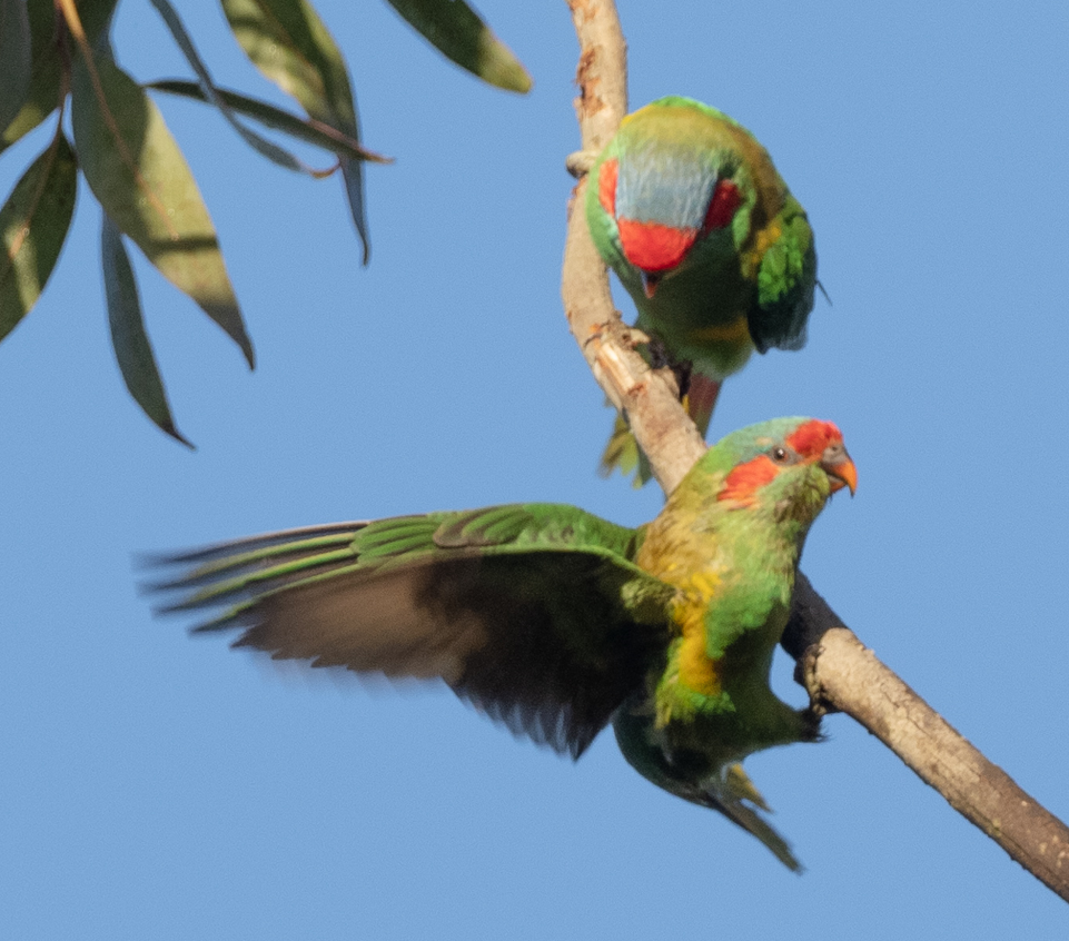 Note the Crimson Rosella with juvenile plumage [the adult is shown alongside]. The Musk Lorikeets were displaying nicely in the morning light too.