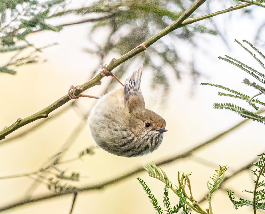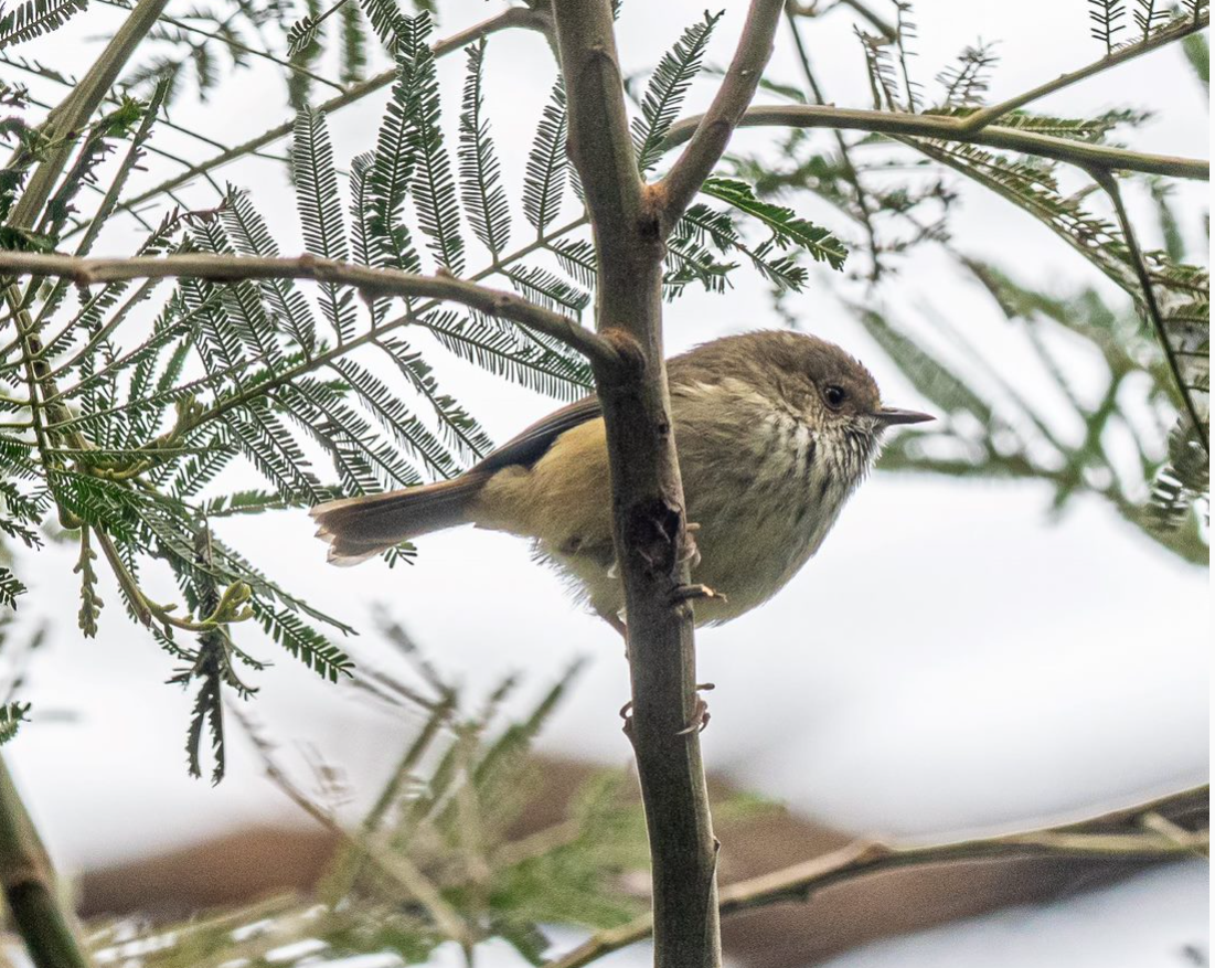 We have also had rarer sightings in the past of the Striated Pardalote (Pardalotus striatus). This is a similar, though larger bird (wing 62-69 mm, weight 9-15 grams) which has stripes instead of spots on the wings and dashes rather than dots on its cap. The males and females look similar to each other and are less colourful than their male, Spotted, relatives.
