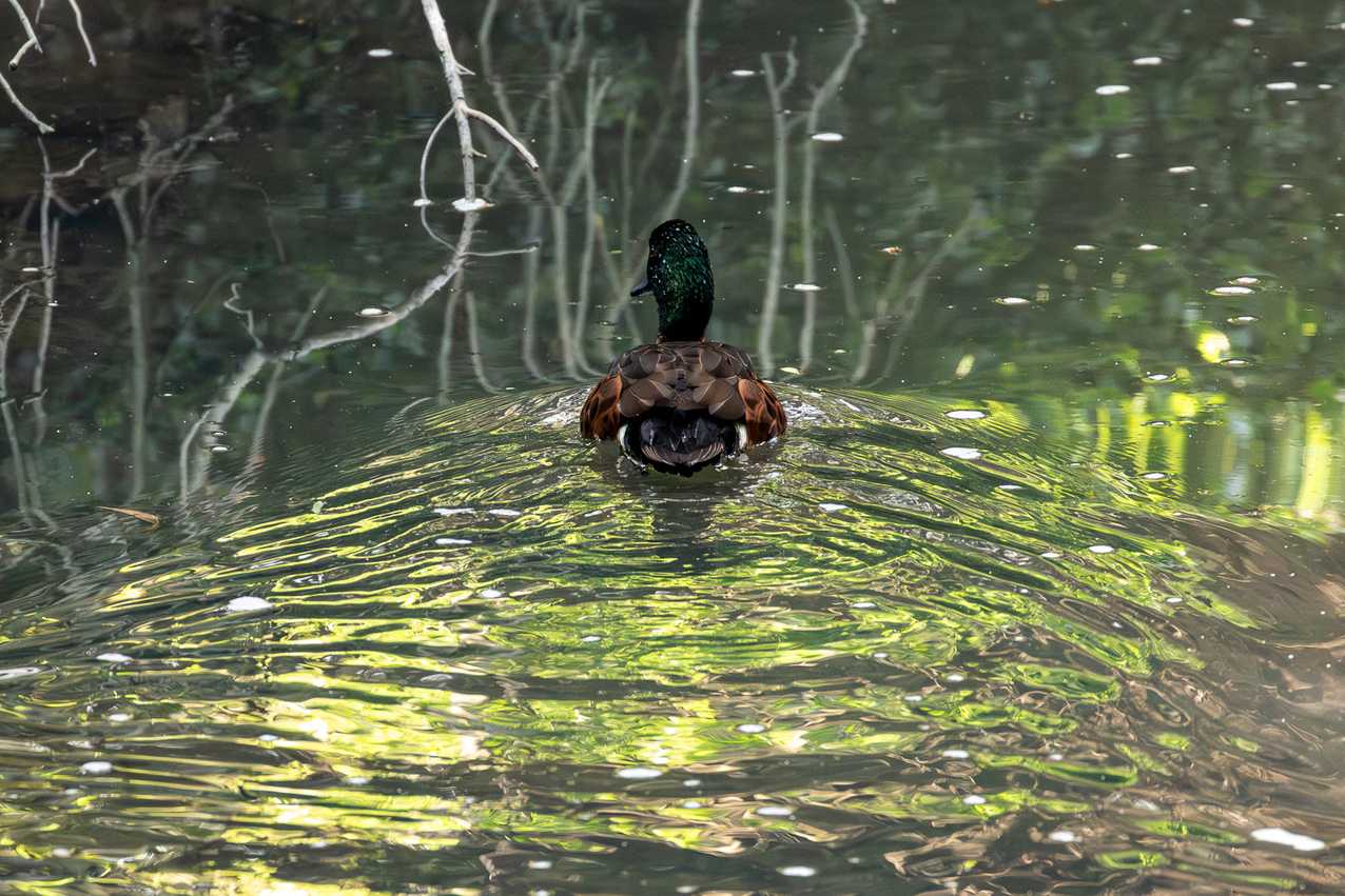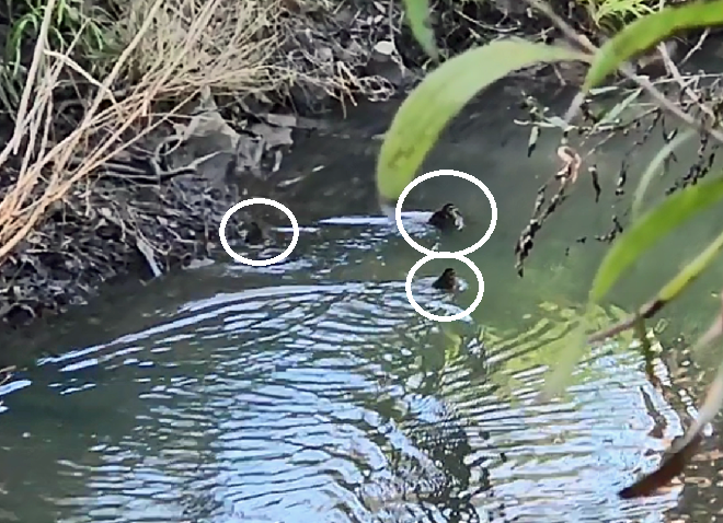 The above is a still from a short movie she took last week which shows three Pacific Black ducklings darting about apparently outside parental control. Interestingly, she also spotted a Wood Duck chick in an unexpected spot not ideal for “ducking and weaving” – in her words: