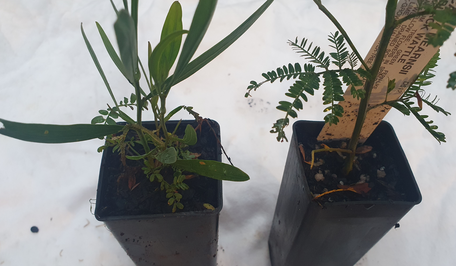 The photo above compares the foliage of the Myrtle Wattle (Acacia myrtifolia) at left and the Black Wattle (Acacia mearnsii). The small true leaves can be seen at the Myrtle Wattle’s base and its phyllodes are developing above (the large green “leaves”). In contrast, the Black Wattle’s similar small leaves are not replaced by phyllodes as it grows.