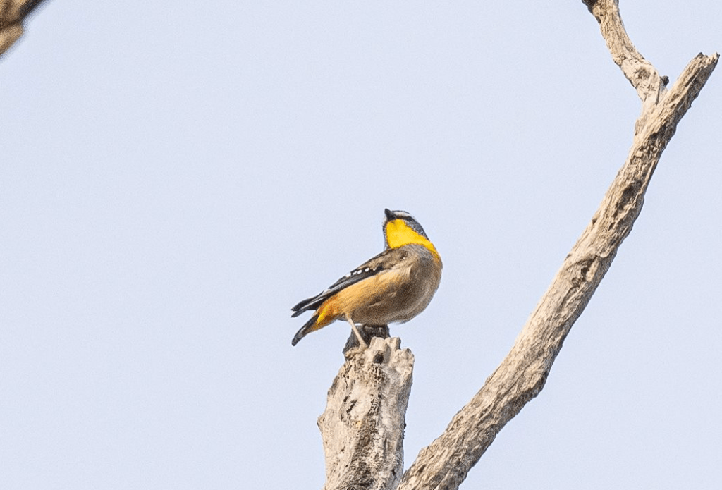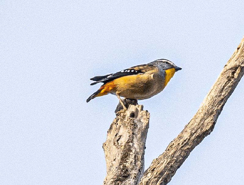 The Spotted Pardalote (Pardalotus punctatus) is quite a pretty species – the males having a distinctive yellow throat and flashes of red in their stubby tails. Males and females both have black wings with white spots and black spotted “caps” on their heads.