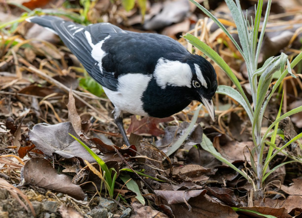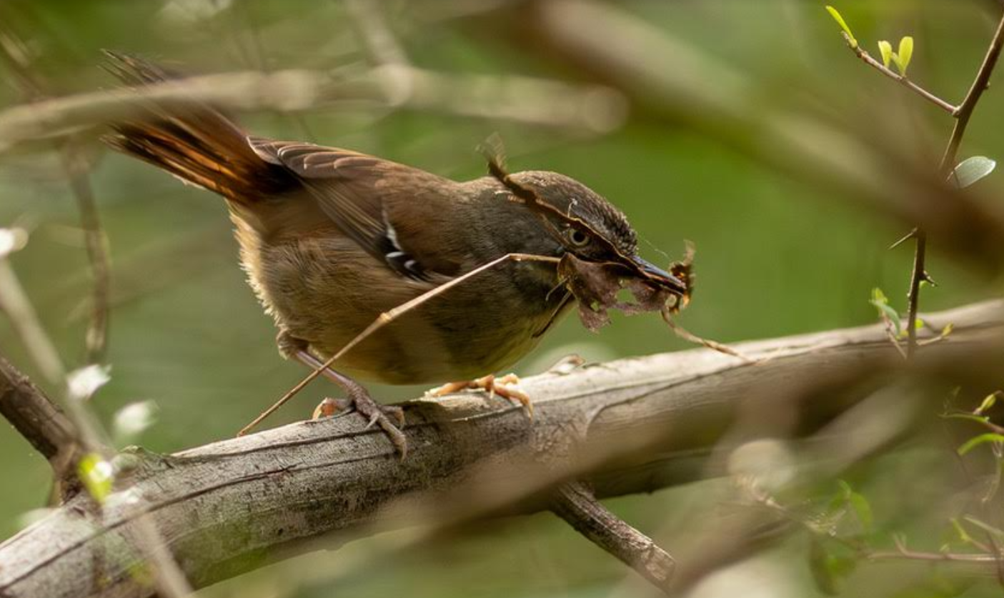 Our picture shows a White-browed Scrub-wren loaded with nesting material – hard at work with its partner building this season’s nest. Note: the “white brow” is obscured by a piece of bark in Lindy’s photo…