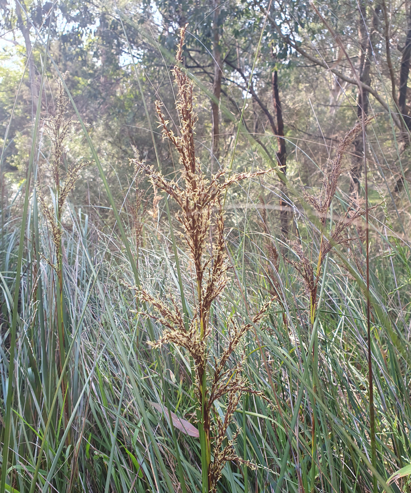 Its leaves are long, flat and rough with quite sharp edges (beware – they can easily cut you!). At this time of year it brightens up – it has a distinctive yellow and brown inflorescence (a group or cluster of flowers), which darkens to a very dark brown as it dries off. It grows up to a metre in height, spreads through rhizomes and is found in eucalypt forest and grassy woodlands.