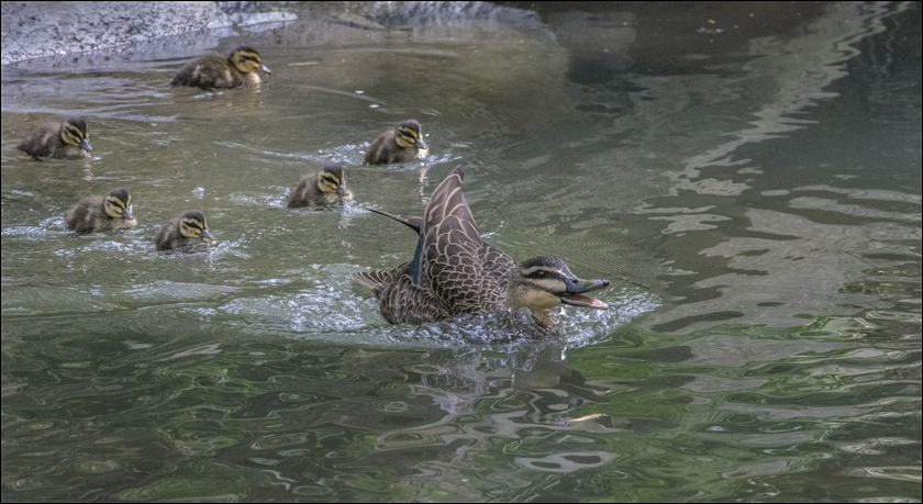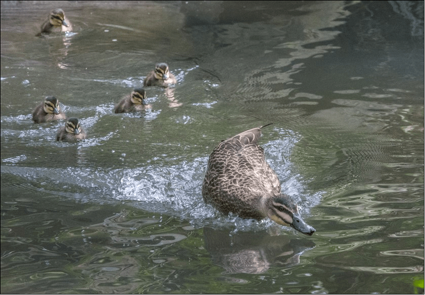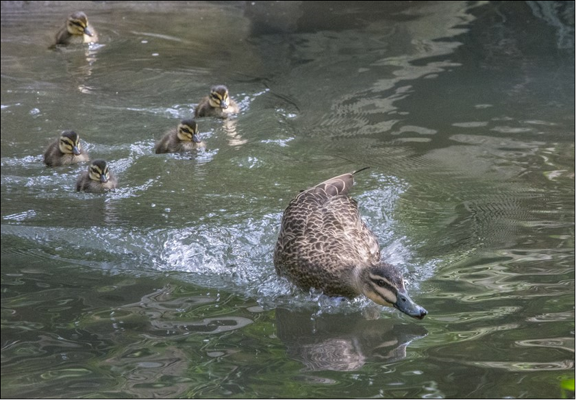 Another of our marvellous local photographers seemingly captured moments when a mother duck was educating her ducklings in fast pursuit swimming – possibly to evade Currawongs! (or is it surfing?):