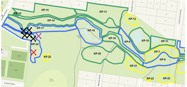 Our camp will be at the purple X. The red X signifies an area where Council undertook some spraying >= 4 weeks ago. The sprayed area is very obvious now (dead Panic Veldt). Anyone concerned about weeding near sprayed areas is, of course, excused from working there…