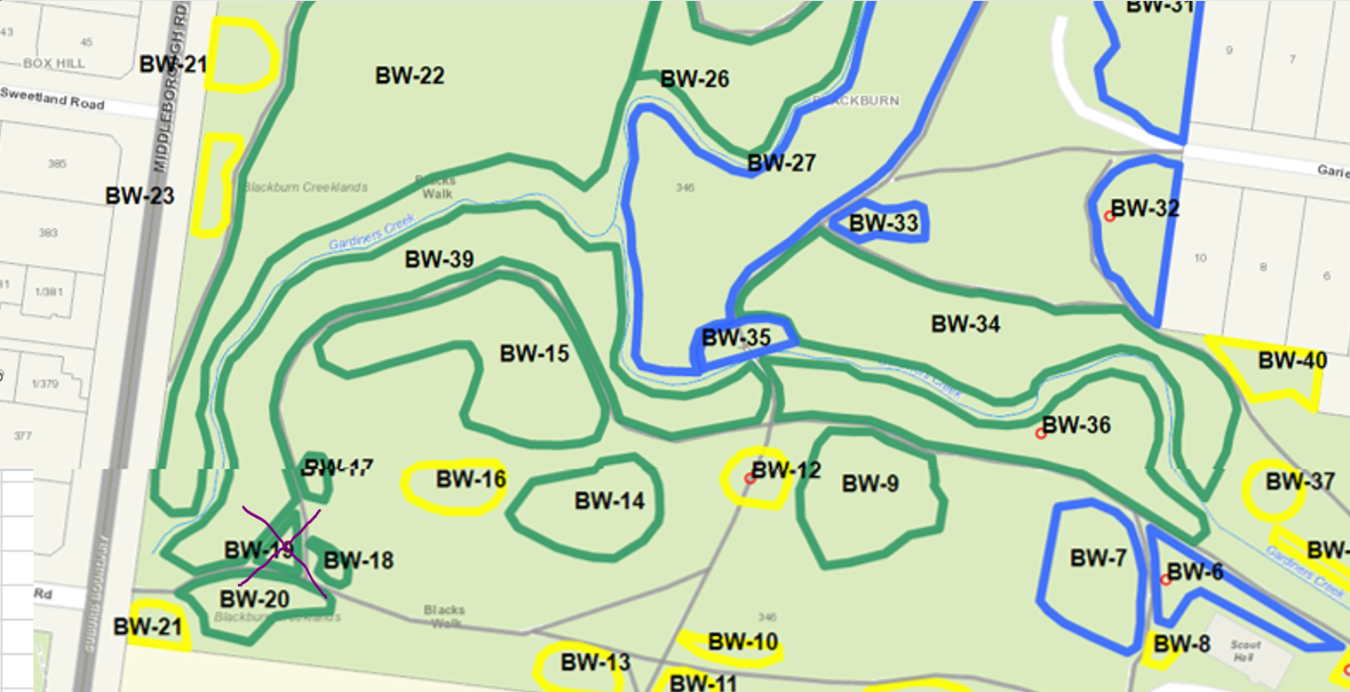 This bed was swapped away from us at the start of the year and nominated to be a “contractor” bed to be looked after by Themeda Ecology. Unfortunately, there was not sufficient capacity in Council’s contract with the contractor to deal with that bed – so it has been left rather unloved. Council has asked us to do a special hand-weed there because it is at one of the park entrances and its unkept state is now attracting rubbish etc. Assuming we have time, we’ll also weed the abutting beds along the path. However, there is a bull-ant nest next to the northern leg of the seat in BW-18 and also nests in BW-20 – so we will need to be very careful working anywhere near them!