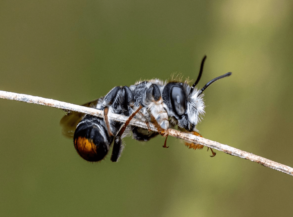 It was sharp eyed Wendy [who helped out with our moths and butterflies] that alerted the presence of these critters roosting in the long grass. They are new to me and maybe the Park (?). There are actually 2 species that are in the photos; one is a wasp and the other a native bee. The wasp [first two pictures] is a Sand Wasp Genus Austrogorytes. The bees are variously known as Leafcutter, Mortar and Resin bees and readily identified by the tips of their antennae and the orange hair on the tail [pictures 3 to 6].
