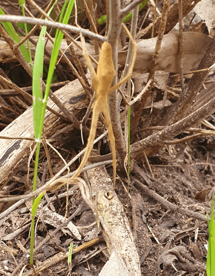 The male looks quite different. Wonderful spiders with huge eyes for hunting. They spin a blue stretchy web that they hold in their 4 front legs while looking down for prey to move. When a creature walks underneath, the spider throws the web over it. Like the net caster gladiators in roman times!
