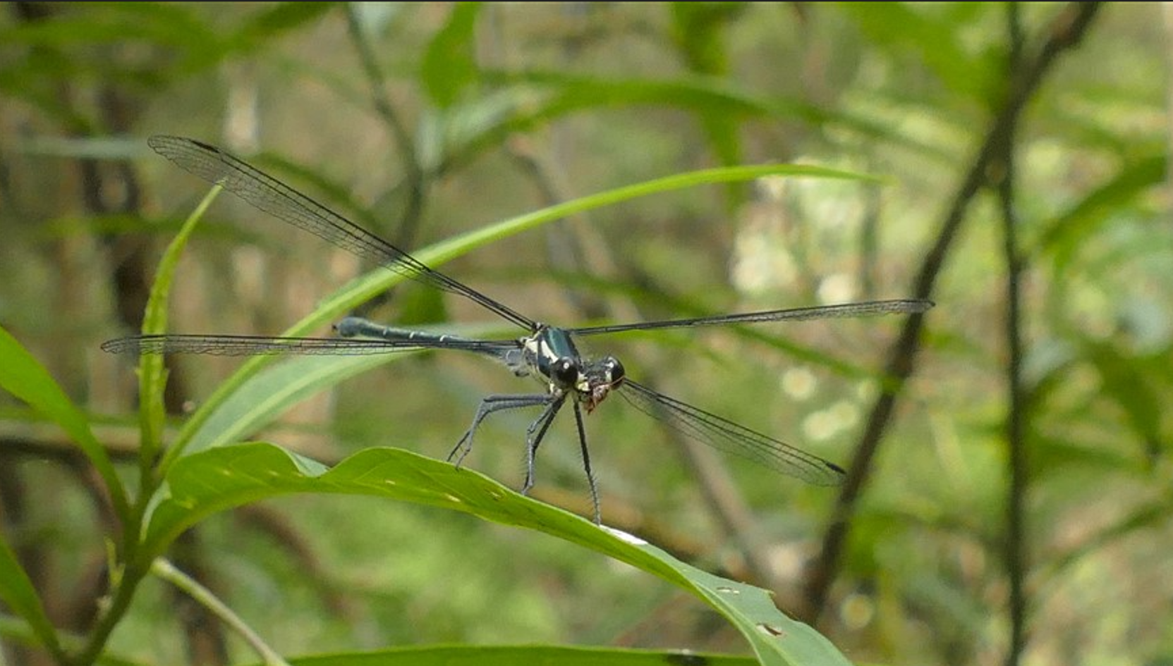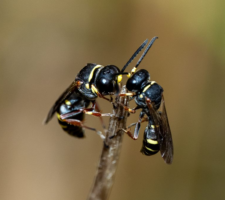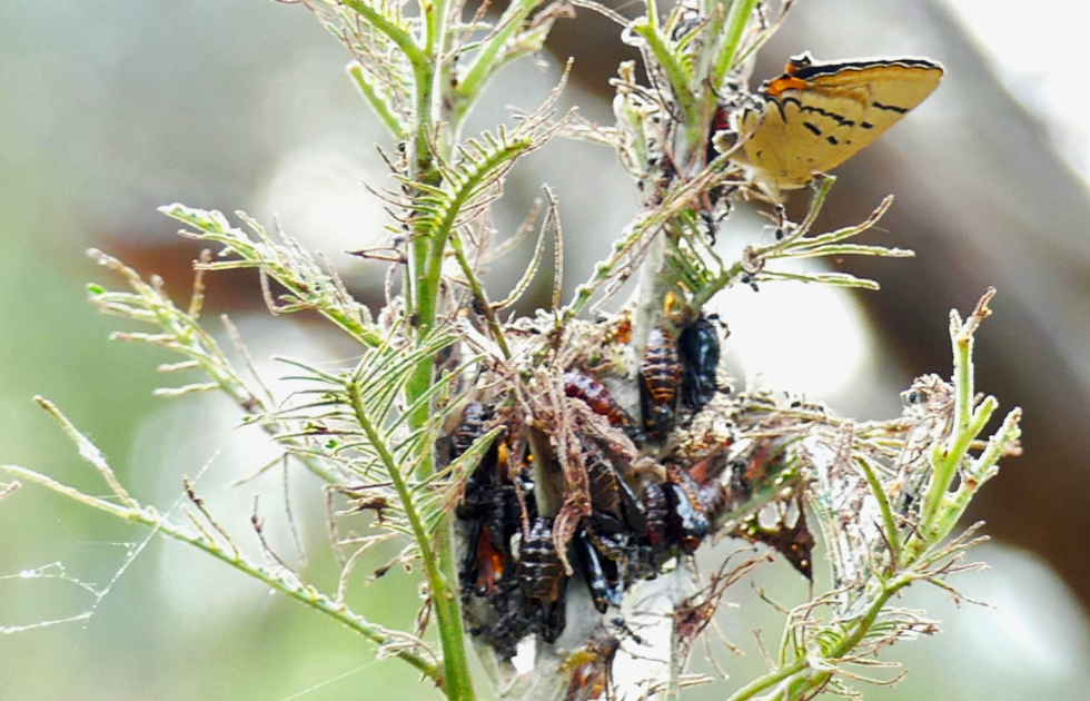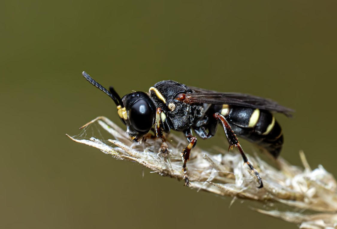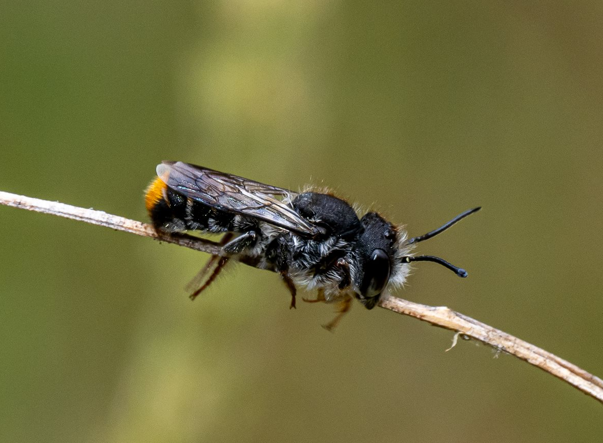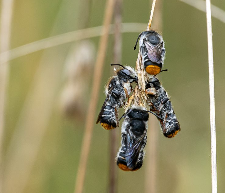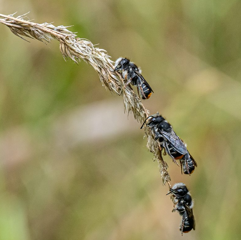 It was sharp eyed Wendy [who helped out with our moths and butterflies] that alerted the presence of these critters roosting in the long grass. They are new to me and maybe the Park (?). There are actually 2 species that are in the photos; one is a wasp and the other a native bee. The wasp [first two pictures] is a Sand Wasp Genus Austrogorytes. The bees are variously known as Leafcutter, Mortar and Resin bees and readily identified by the tips of their antennae and the orange hair on the tail [pictures 3 to 6].