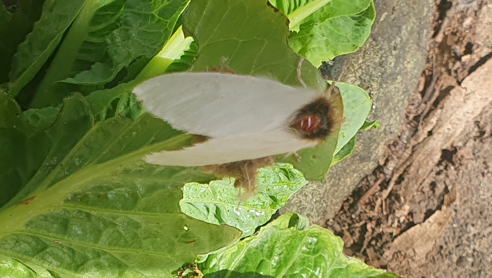 Wendy confirmed that the moth is known as Sparshall’s moth, sometimes known as the Long-tailed Bombyx (Trichiocercus sparshalli). It is a stout bodied, hairy, mostly white moth with a dark patch behind the head. It is widespread in Australia and tends to prefer eucalypt parklands (like ours) and eucalypt forests.