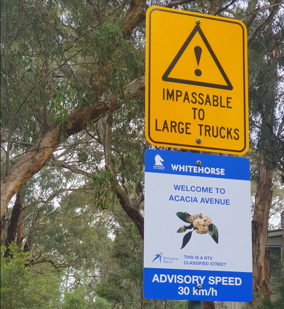 New Council road signage has recently gone up in parts of the “Bellbird Area”. Some of the National Trust classified streets in the area have trees quite close to the road and also have significant low overhanging branches. Large trucks therefore run the risk of damage to the trees and to themselves.