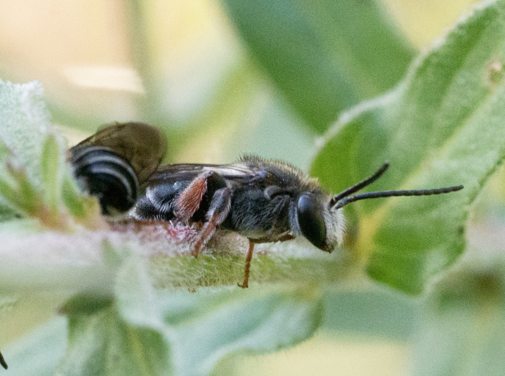 The bee has been identified as an Austronomia bee in the genus Liptotriches. Its common name is the Red-legged Nomia bee. The beautiful pink/purple flowers belong to the indigenous Purple Loosestrife plant which loves wetland environments.