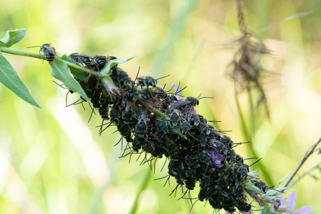 The males of some of our indigenous bees sometimes roost together in significant numbers for reasons that are not clear. The best guess is for warmth and protection – given they usually only return to roost when the temperature starts to drop. On the other hand, the females tend to be solitary and stay in their own burrows underground.