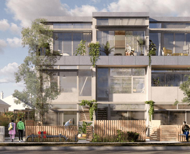 “Future Homes” are apartments in three storey blocks built to one of four standard government designs. The designs are available for purchase and can be adapted to a specific site through a streamlined planning process. The State government is subsidising the cost of the plans. The designs, including access to the streamlined planning process, currently cost $150 with claims that the “usual cost is $15,000”.