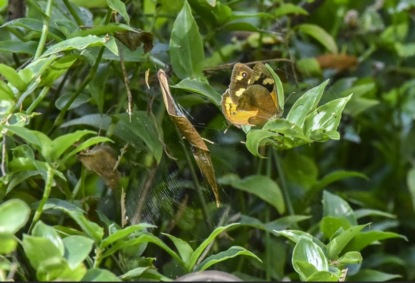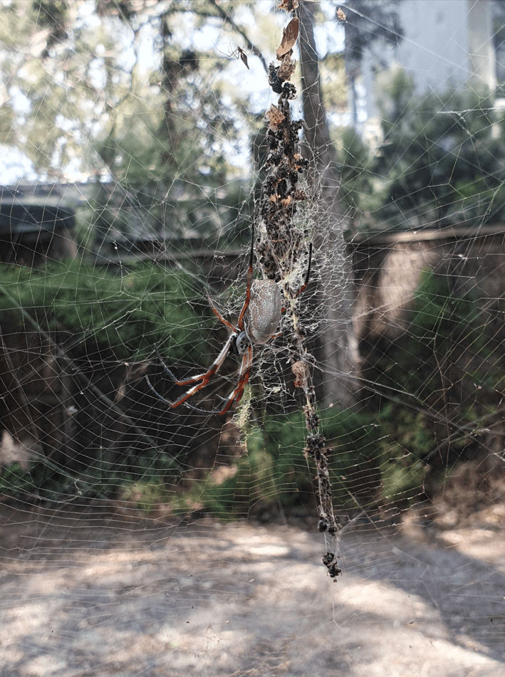 Their “golden” webs are permanent, very strong and repairable. The long strings that look like a stick caught in the web are actually food items wrapped in silk – set aside as a larder for leaner times. The males are much smaller and need to tread very carefully if they have romantic intentions… as does the smaller spider towards the top of the photo who we think is freeloading in our girl’s web.