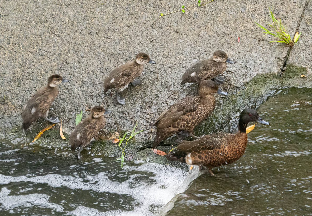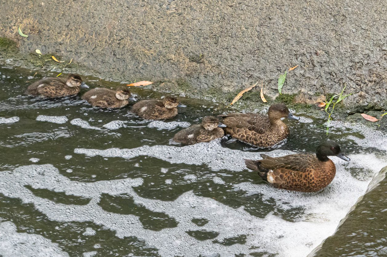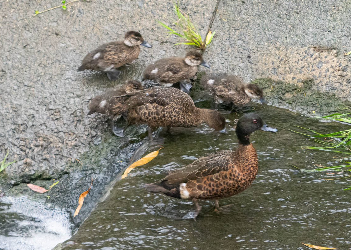 Our photo shows a Chestnut Teal duck family cruising up the creek (in its unnatural, concrete barrelled section) when Dad, the leader, confronts a problem – a waterfall where the concrete rises a level…