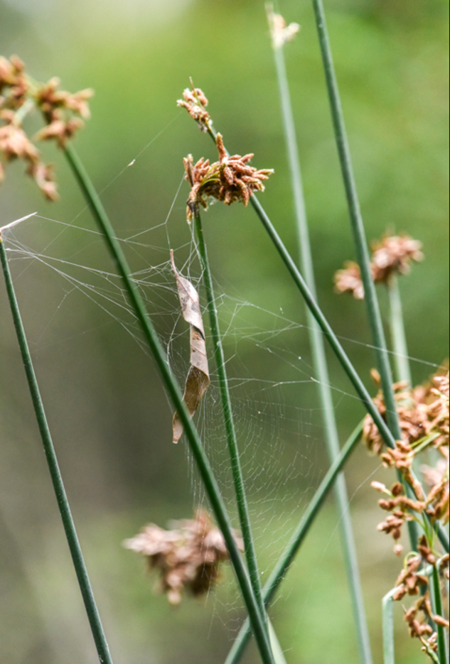 Nature is amazing: very clever of the spider to be able to weave different grades of silk – one taut and strong for the supporting structure and the other a bluish stretchy net! Even colour-coded!