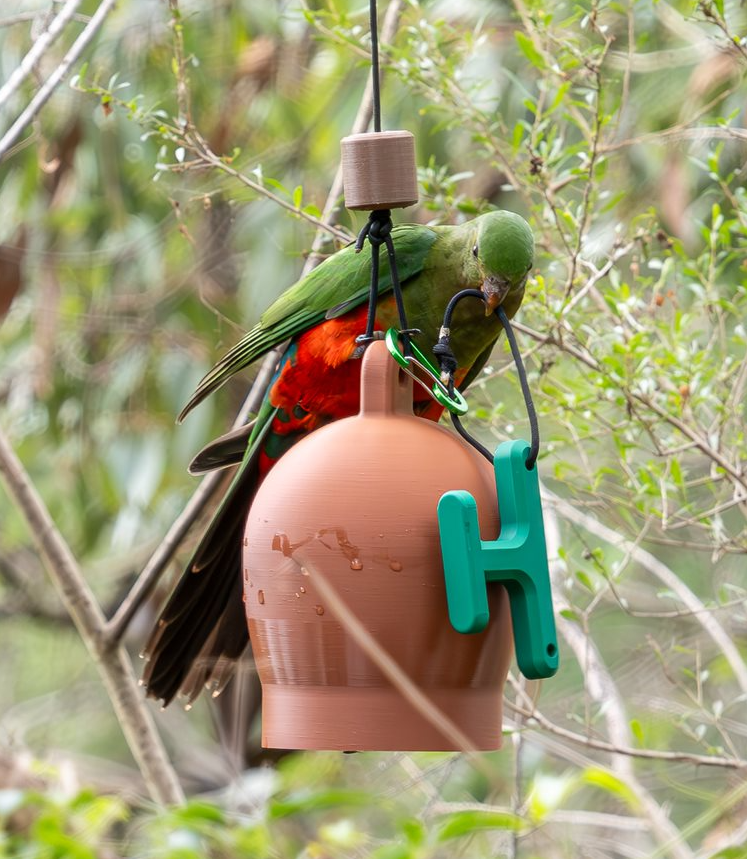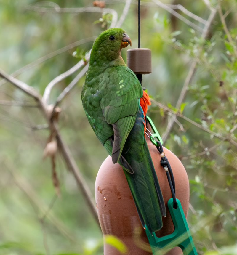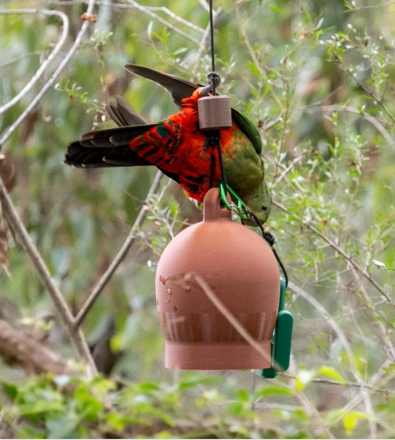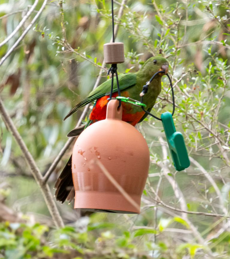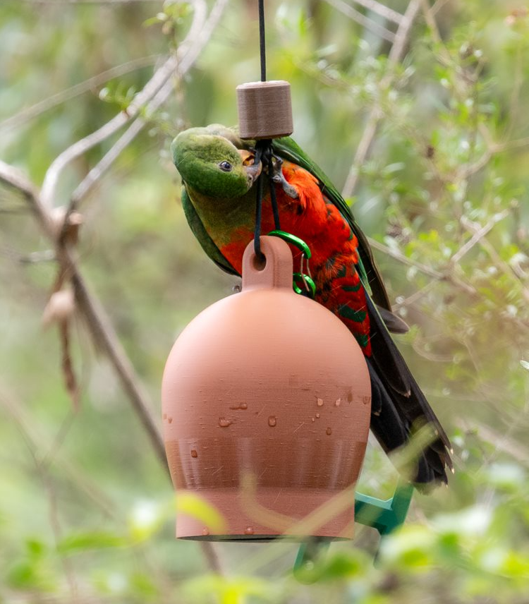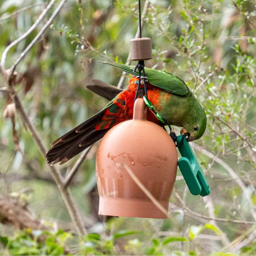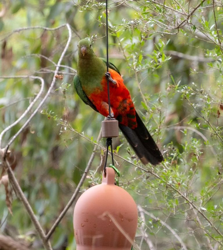 The “bell bird” is actually a female King-Parrot intrigued by a bell (?) which seems to be a part of one of those geocache puzzles or the like. We think the bird may have encountered a bird feeder of similar appearance earlier in its life and was very keen to make it deliver food by pushing the right button – whatever that may be. So, Bellbirds have not returned !