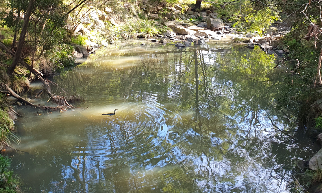 It would be great news if the invasive Common Myna has been eliminated from the park. They have had a small foothold in Blacks Walk since we began our walks in 2012. The seasonal Grey Fantail has been seen this month (see Other Creeklands Sightings below) as have the other “missing” species. A Little Pied Cormorant was snapped hunting in the pond at the Laurel Grove bridge the very next morning:
