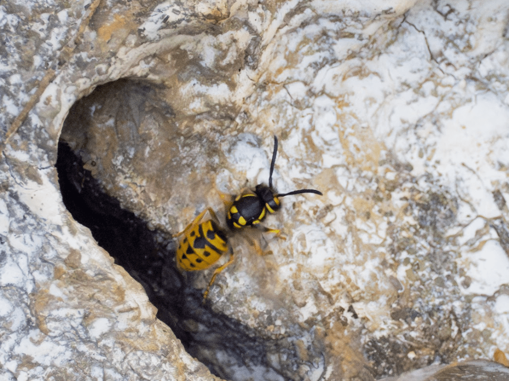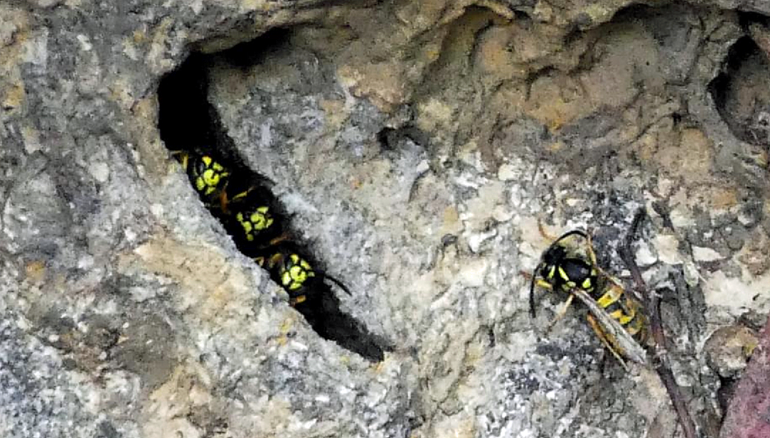 A young participant in a recent bird survey noticed an unusually situated insect nest – in a crack in the concrete abutment to the outlet of Blackburn Creek. Russell’s close-up photo (from a respectable distance) revealed the ferals to be European Wasps: