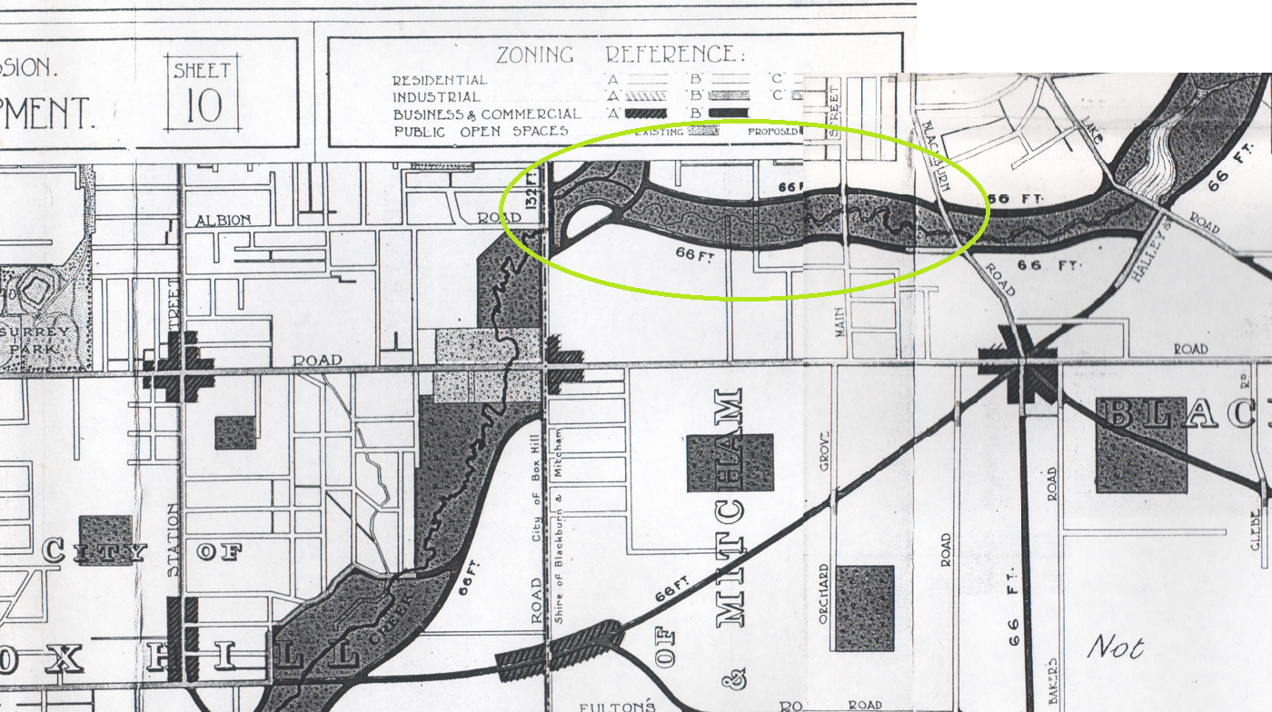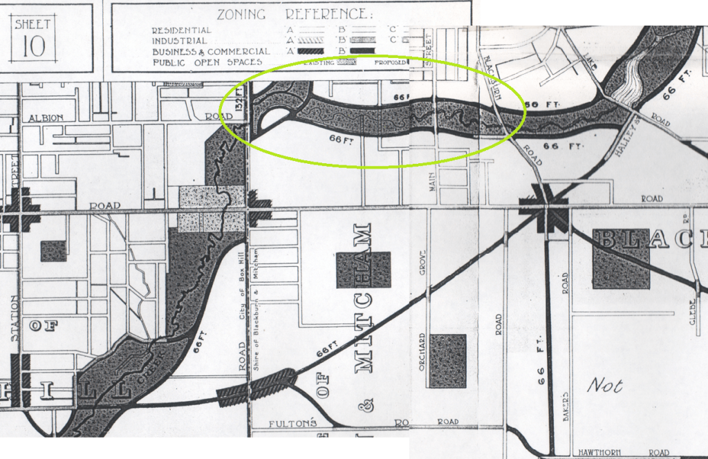 We’ve stitched parts of Sheet 10 and Sheet 15 (on the RHS) together to show what seems to be a planning nightmare that has our creek apparently squished between dual 66 feet (approx 20m) road reservations that also continue on to flank Blackburn Lake! The green oval shows the approximate location of the Blackburn Creeklands. It seems Blackburn Creek also suffers the same fate (the creeks’ confluence is near the top of Sheet 10 – on the left side of the green oval). The plans also show a bizarre continuation of Riversdale Road (at the bottom left) that arcs across the grid to meet Canterbury and Blackburn Roads in a six-way intersection before continuing on to join Halley Street near Blackburn Lake.