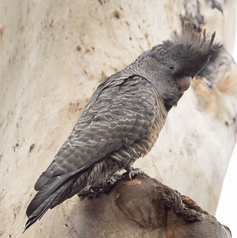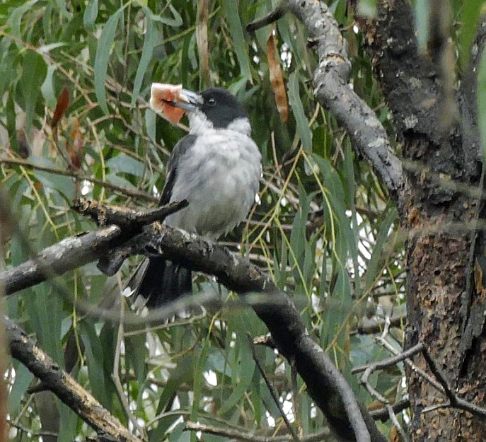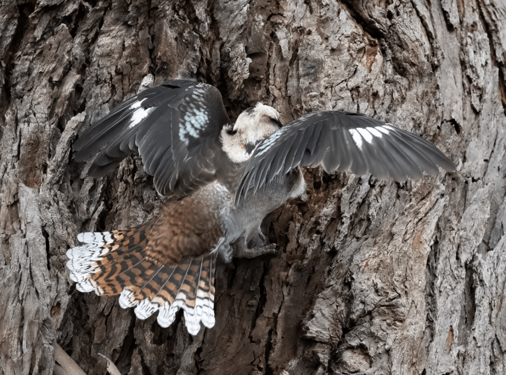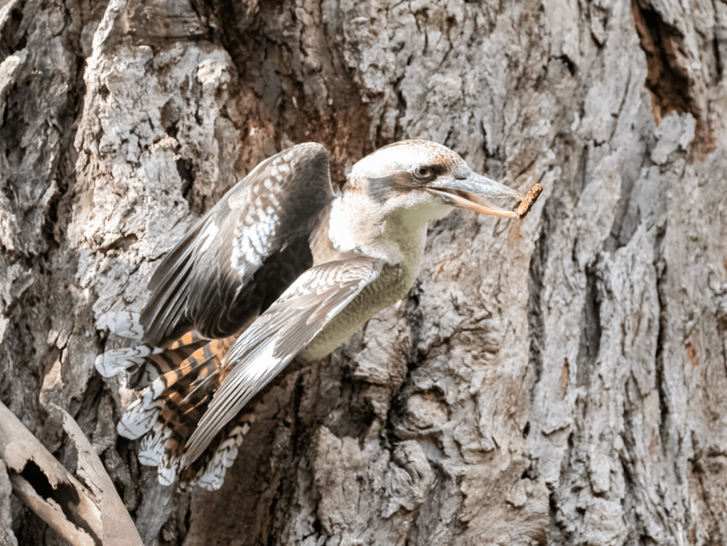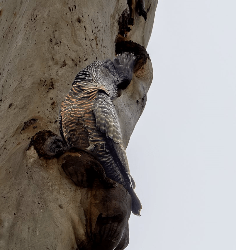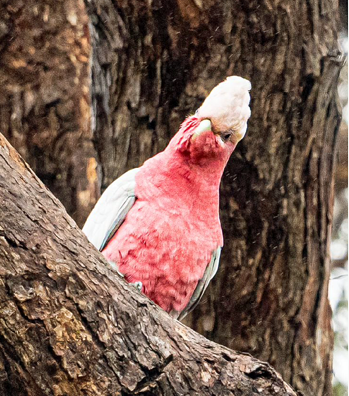 Taking turns, the male and female pair kept flying to a particular spot on a gum tree removing bark from it. They kept this up for at least 20 minutes while we were there, and we saw them still doing this several days later as well. At first, I thought they might be gleaning grubs from under the bark, but inspecting the photos, I can see they are taking bark away from the tree in their beaks, dropping the bark on the return flight. I concluded that they are in fact trying to make a nest [hole]. Perhaps they can hear that the tree is hollow underneath or perhaps it is a long term project.