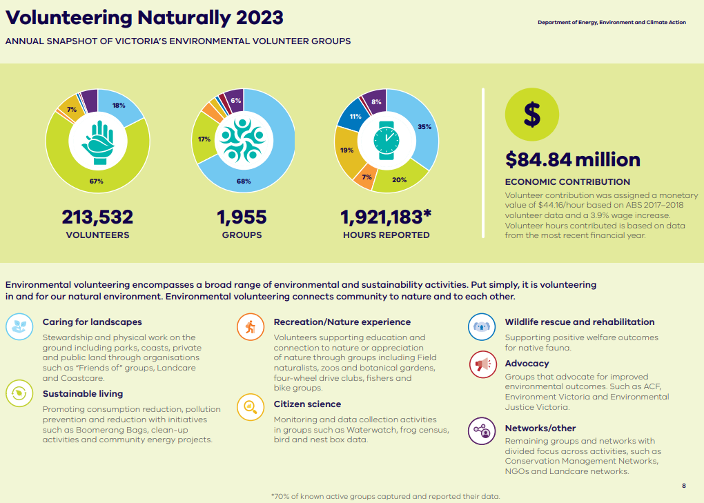 The fine print says that 70% of known groups report their data – so this is significantly under-estimated due to under-reporting and the work done by groups not known to DEECA. It would be safe to say at least $100 million per annum!