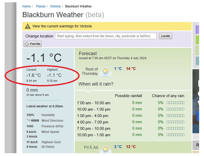 Mild frost was evident on the oval and nearby mown areas – this was the weather situation at 08:25 on 4/7 (note that we usually start at 08:00 (with set-up and site inspections) prior to most volunteers arriving at 08:30):