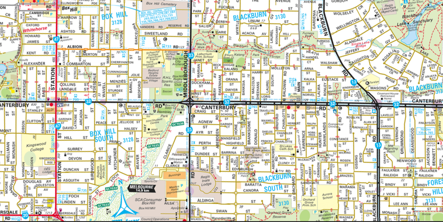 It’s interesting to compare the map with today’s Melway using a “slider”. Our apologies for the very rough line-up of the two – best we could do with our limited tools. Nevertheless, you can see that today’s street layouts of Box Hill / Box Hill South were pretty much in place by 1929, less so for Blackburn / Blackburn South and not at all for Forest Hill: