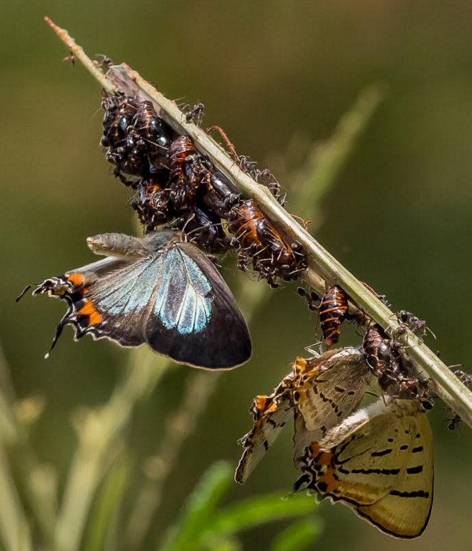 Ken (our photographer) noticed that the butterfly lacked the “dangly” parts of the hind wings of the Imperial Blue (see Ken’s 2018 photo of a Imperial Blue metamorphosing at left for comparison).