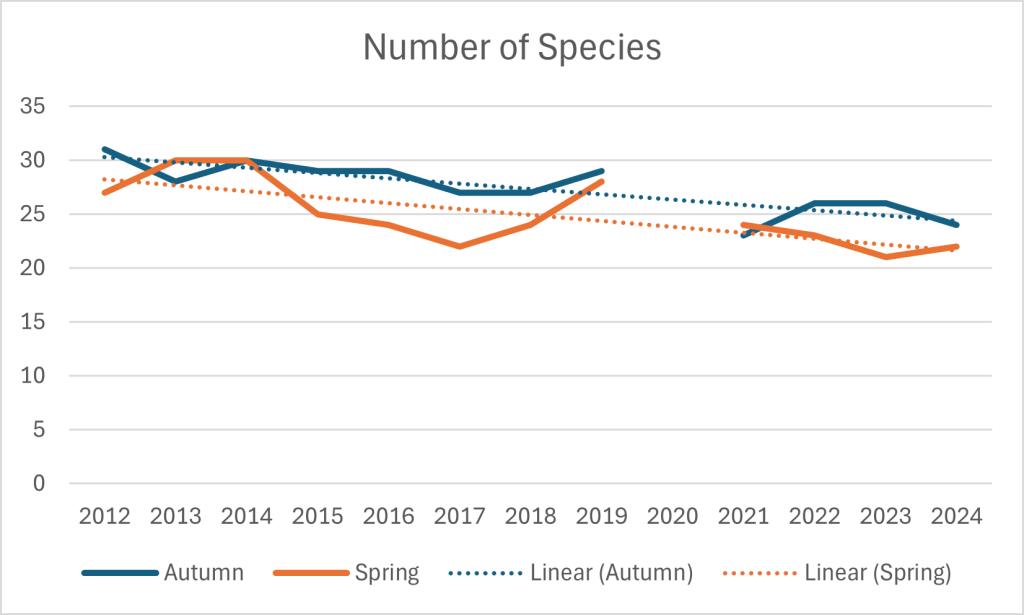 Sadly, declining diversity does seem to be the trend in both Autumn and Spring in the Creeklands – despite the uptick in 2019 (trend lines are shown by the dotted lines). It is likely that: