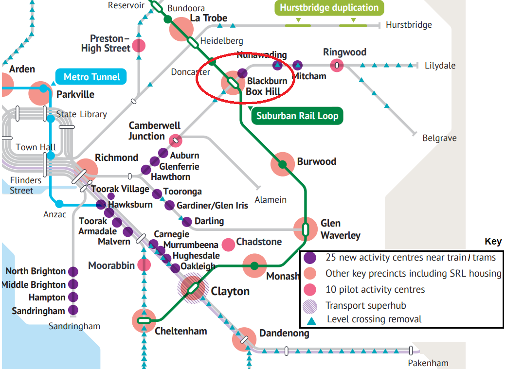 The State Government announced further densification in our area on 20th October: Blackburn, Nunawading and Mitcham are three of about 50 Activity Centres where taller blocks of flats will be fast-tracked – here is an excerpt of a map which shows some eastern and southern suburbs: