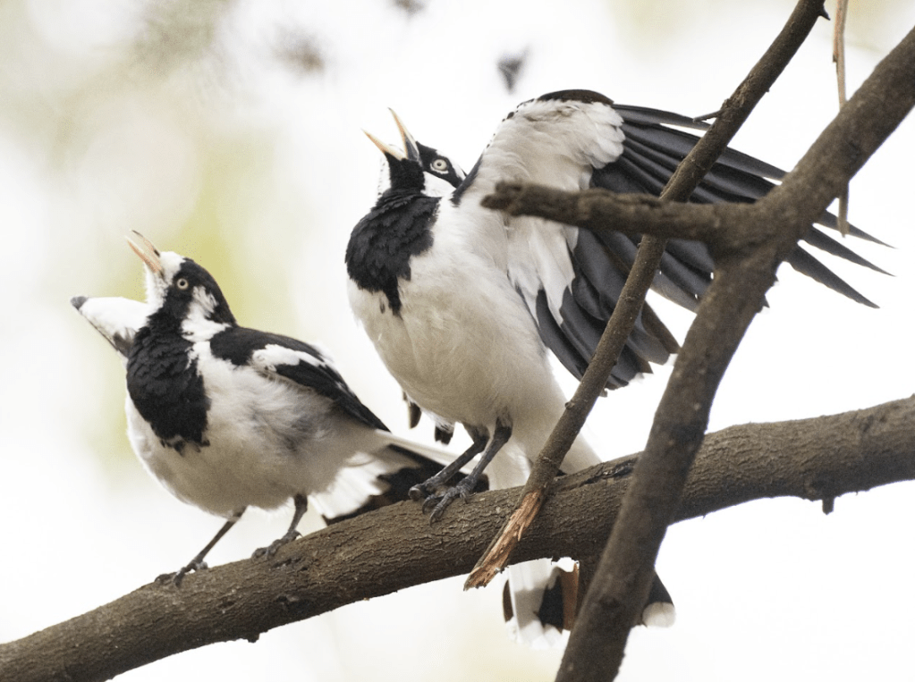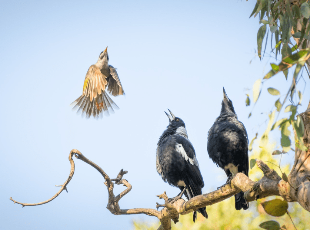 - Apparently, the Noisy Miner found the Magpies‘ carolling rather uplifting!