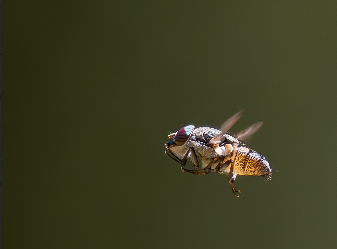 Compared to a bird, the fly’s wings look far too small (at least relatively, given that bulk). Notice the blurring of the wings? – they have to flap them so fast to even hover (1/3200 sec was the shutter speed – about a third of a thousandth of a second!). Flies do not reach a high speed (say 8 Kph) compared to a bird (40-150 Kph) – but they obviously have to work hard for it!