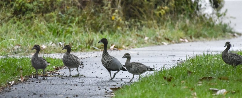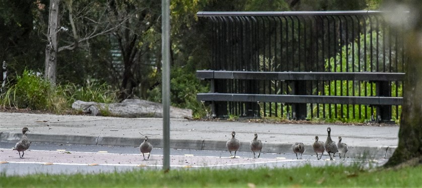 Wood Ducks do seem to make excellent parents – tending and marshalling their young very attentively. However, we regret to advise that they still haven’t quite learned how to use the newish crossing in Main Street! They’ve nearly got it right – it must be confusing given there are tracks on either side of the bridge – but only the southern side is protected by the zebra crossing – not the middle!