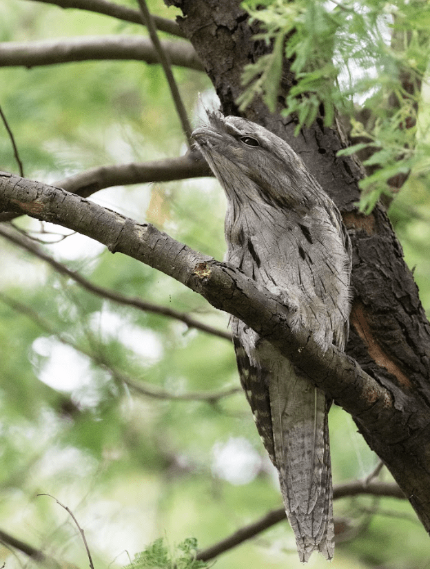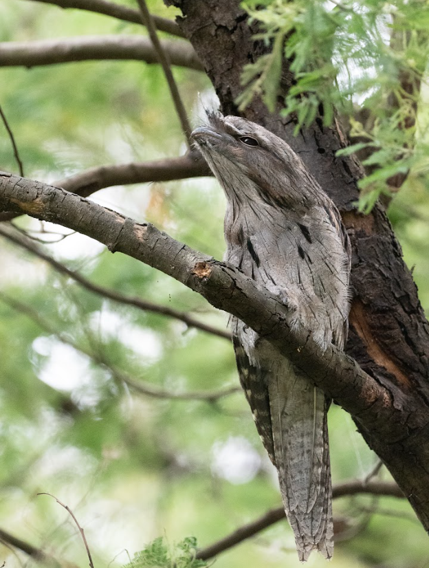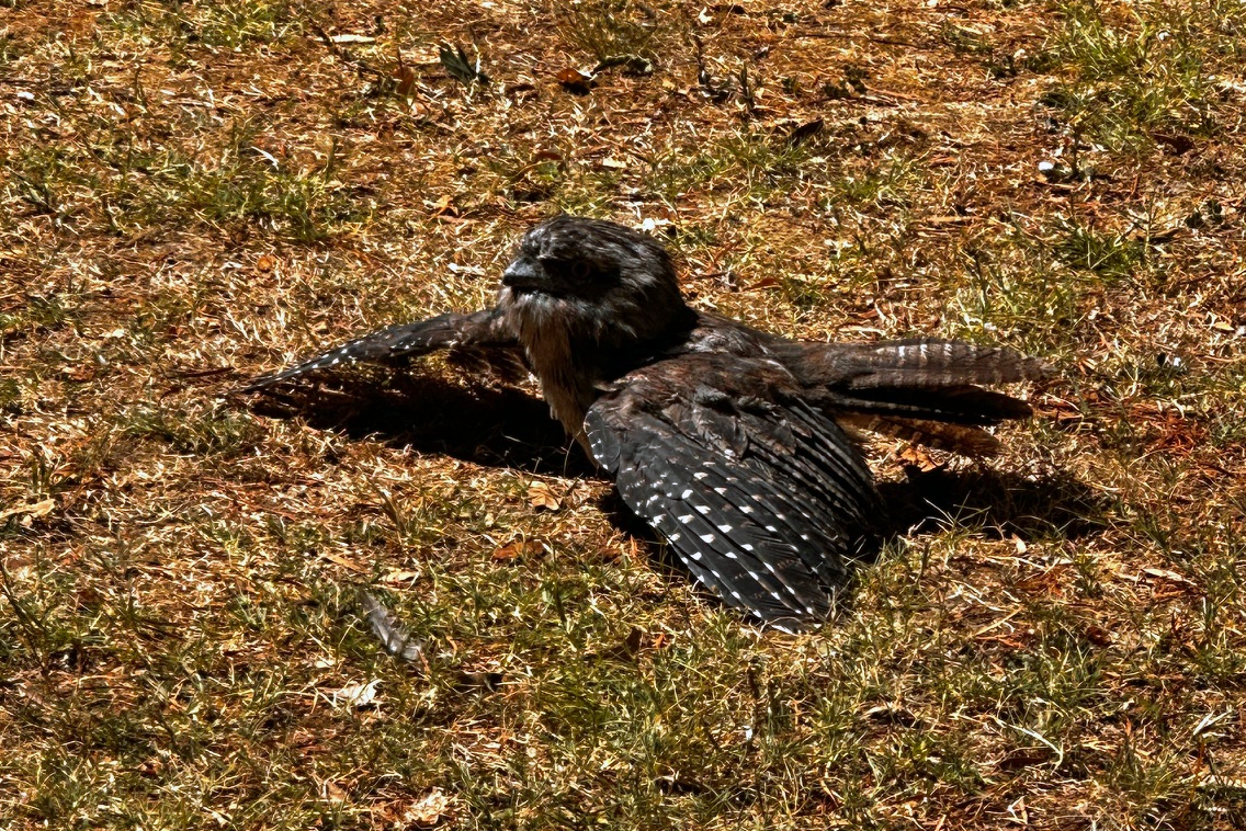 One of our local birdos thinks that the bird was sunbathing. Other species of birds do sunbake – but it would seem unusual for a nocturnal bird like a Tawny Frogmouth, to be doing that. All this happened in full sun around midday. Maybe it’s a way of getting rid of parasites ?