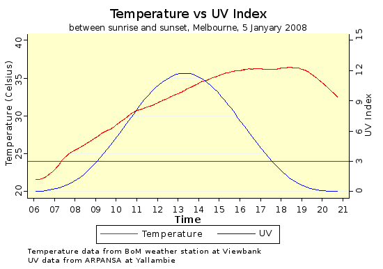 No, the BoM graph at left shows temperature and UV index on a hot summer’s day in our area.