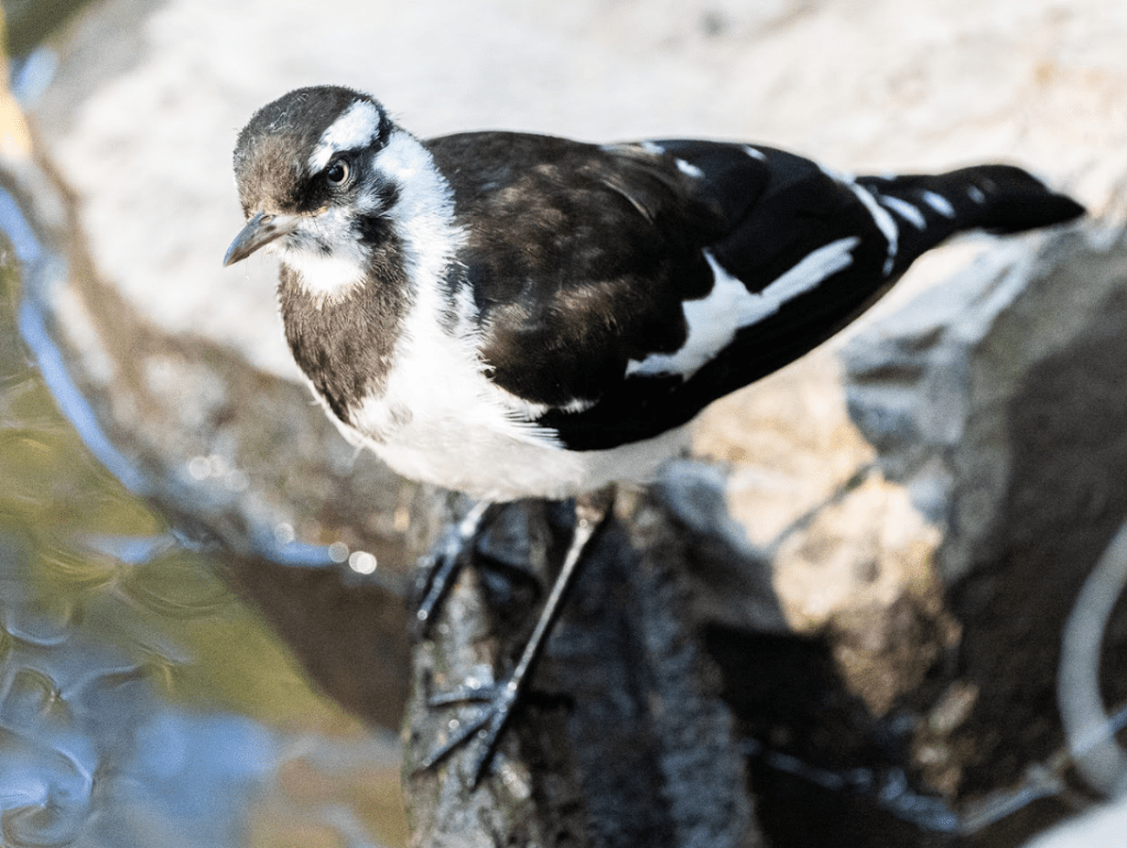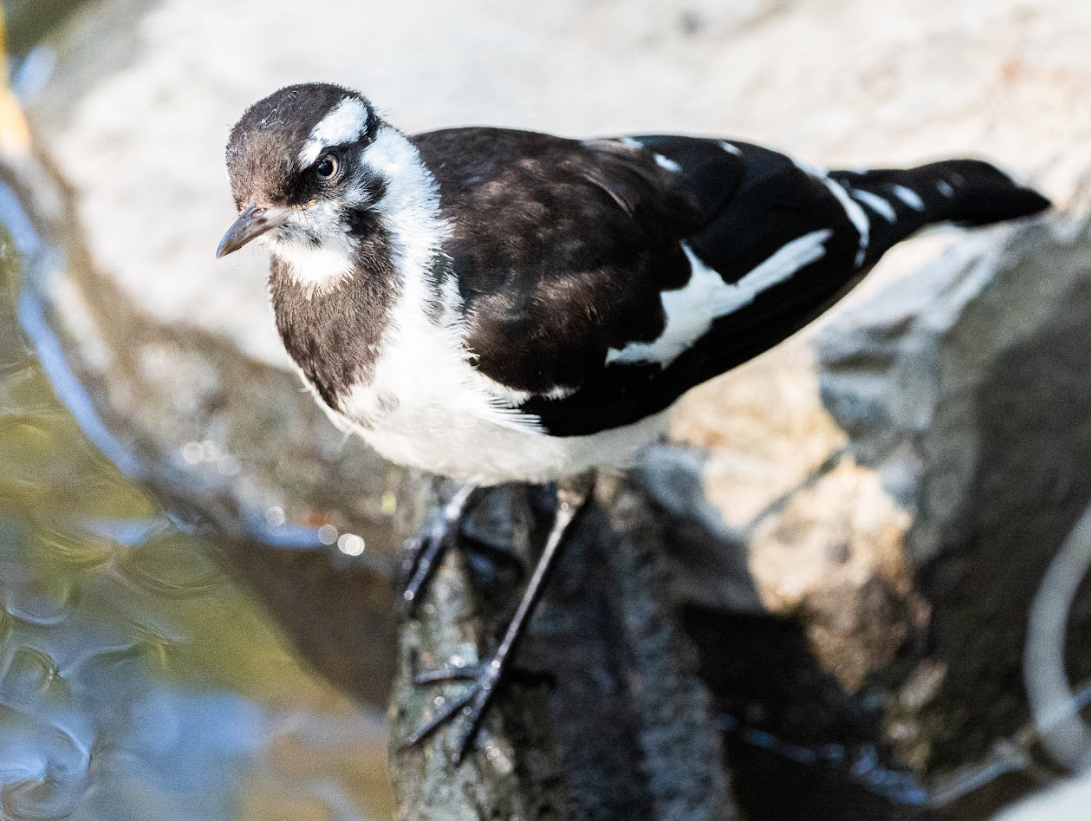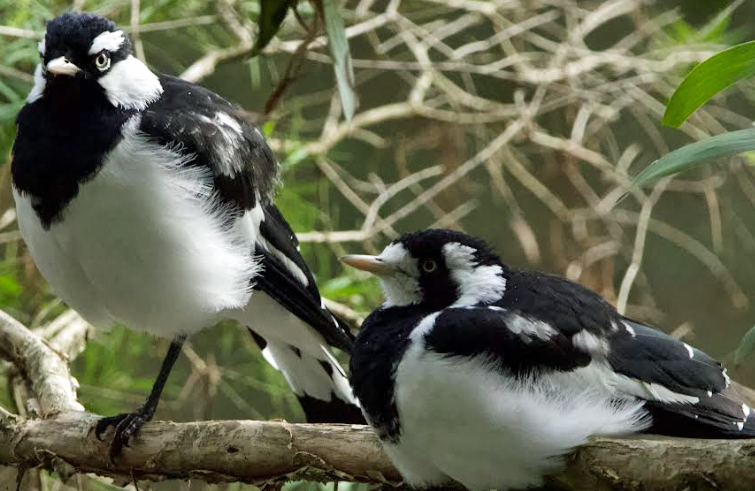 You got it – yes, these are the juveniles shown towards the end of the photo gallery above. Young Mudlarks have a mixture of both sexes’ features. Q: So how do you tell whether they are boys or girls ? A: It’s not easy! It is not a question of parting a few feathers as this author once blithely suggested to the great amusement of our birdos… Birds have a cloaca (shared cavity with single opening to the exterior for passage of products of reproductive, urinary and digestive systems) but generally no external genitalia. There are exceptions – for example, domestic chickens can be sexed by experienced workers reasonably reliably.