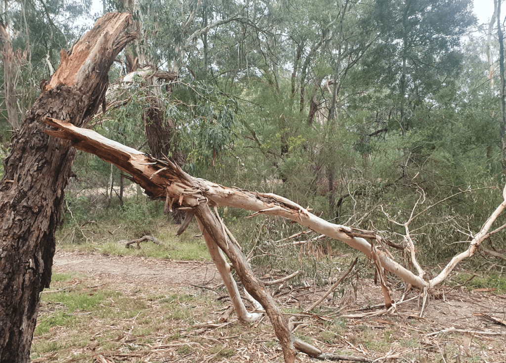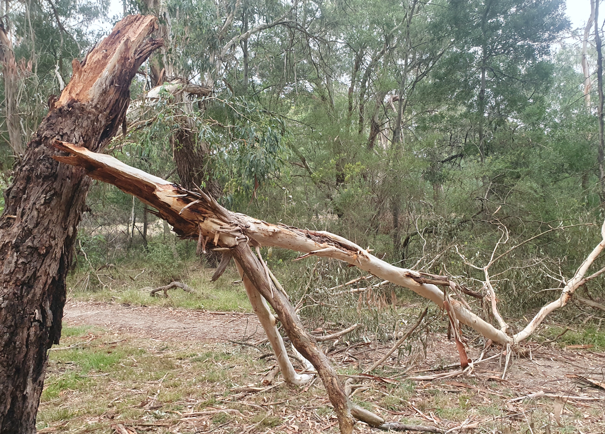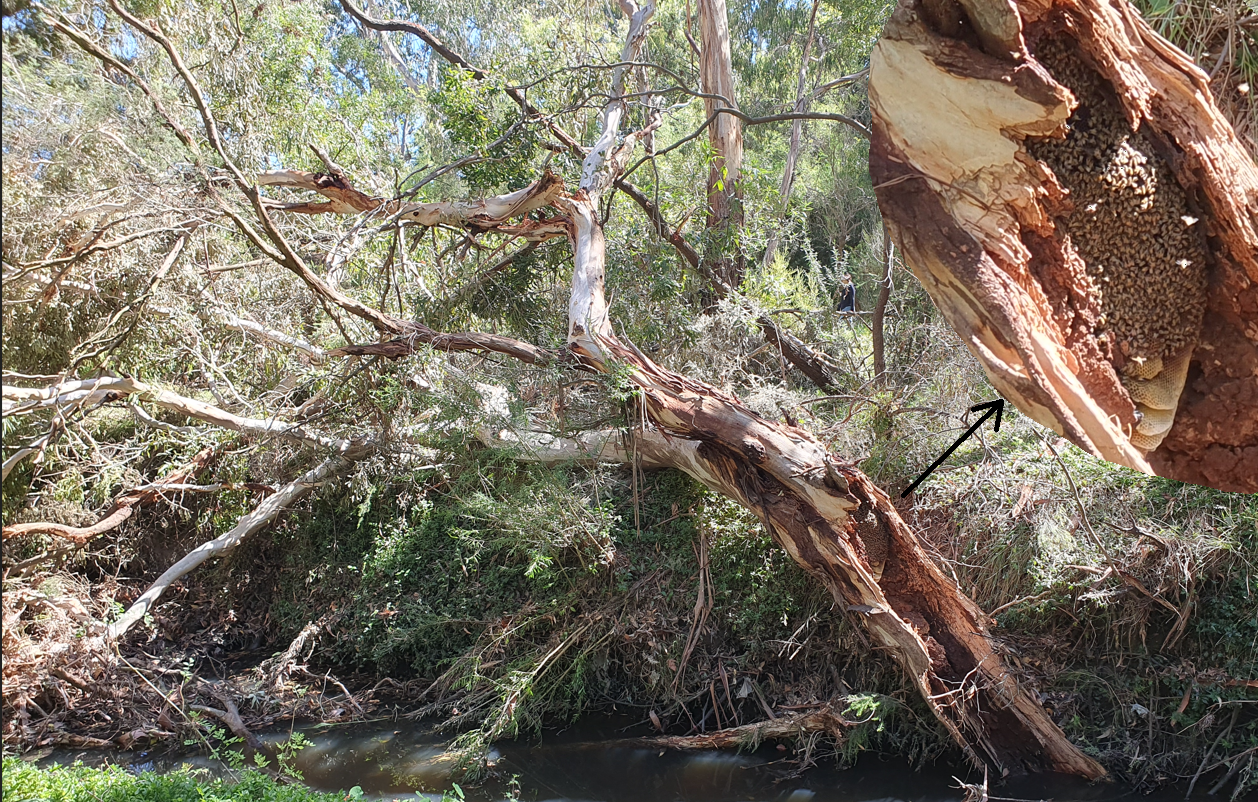 One significant loss was the top of this important Manna Gum coming down into the creek in Kalang Park (12/2). Because fallen branches are actually in the creek and impeding stormwater flow, we expect that Melbourne Water will dispatch a crew for the clean-up. One complication will be the (feral) honeybee hive in the trunk (shown enlarged at top right) which was immediately above where the trunk snapped. Interestingly, the bees do not appear to be too fazed by the damage to their home! The falling wood also knocked a tall stag over as well as some advanced saplings.