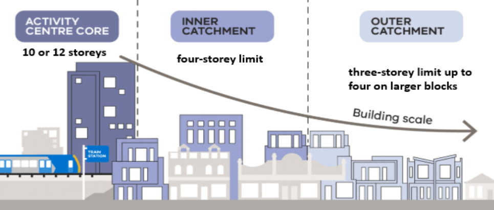 In the cases of ten pilot Activity Centres, the state government has reduced height limits for medium-density blocks of flats and shrunken the boundaries of the Activity Centres to better protect suburban amenity. Higher-density developments near train stations are still encouraged.