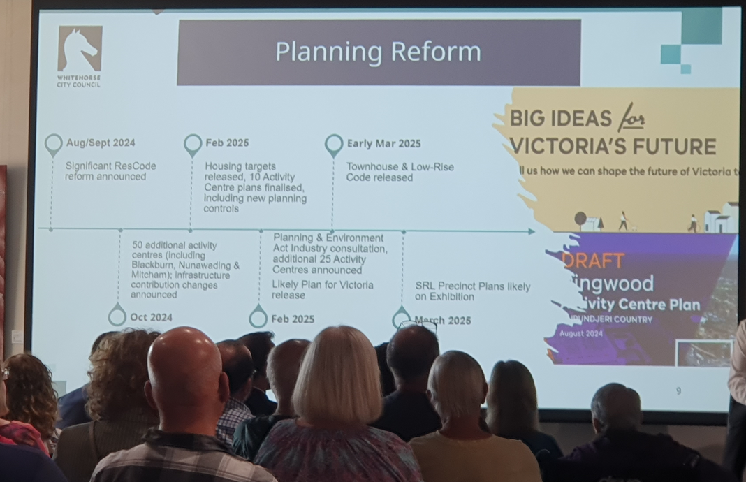 Whitehorse Council’s Community Planning Forum QnA on 27/2 was serendipitously well timed to include the latest barrage of changes from the State Government listed above – which has left many of us bewildered by the local implications. The State Government seems to be throwing everything it has in its armoury at the housing capacity issue. We are confronted by the most significant changes to our planning system in decades.