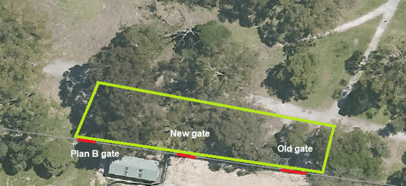 The light green polygon roughly shows the extent of the reveg area. There will be a pathway and seating near to the gate. The old gate will be retained for emergency access only – so we can’t plant up too much in front of it.