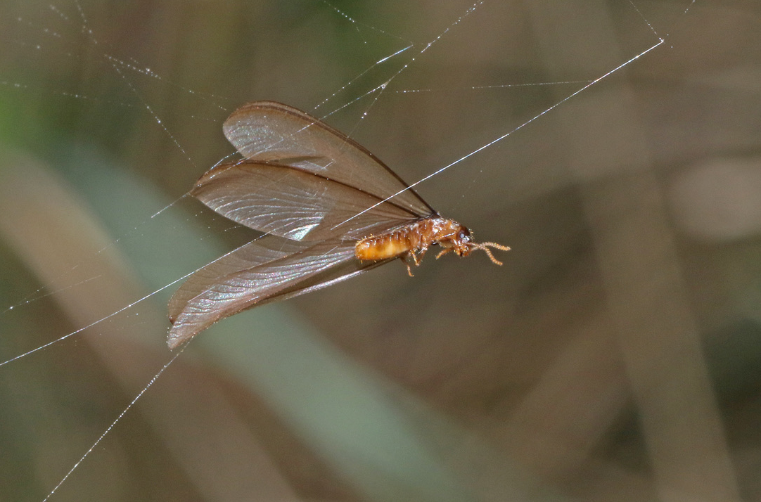 - Alate or Winged Termite: these adult termites can emerge from a termite mound in large numbers to try and form new colonies. They are not strong fliers and often don’t go very far. The one in the pic has had the misfortune to run afoul of a spider’s web.