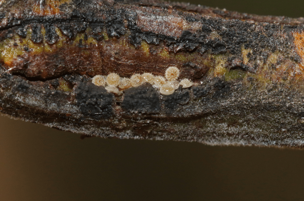 - Common Imperial Blue: here are three shots of a Kalang Park favourite, the Common Imperial Blue butterfly; Jalmenus evagoras. Like most butterflies, they are seasonal – really only about in the warmer months. At this time of the year, they are getting ready to ‘over-winter’ (as eggs!). Indeed most of these butterflies have now disappeared; the adult and chrysalis shown here are some of the few still to be seen. Most females have already laid their eggs (last pic) and died. The eggs are very hard to see as each one is less than 1 mm in diameter.